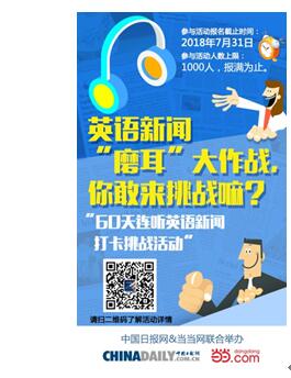 2018這個夏天,中國日報網攜手當當網推出首期“60天連聽英語新聞打卡達人活動”,你不僅能通過中國日報網外籍專家的純正英音、美音了解每天世界上的精彩趣聞,還可以考驗自己的毅力和自律性。60個工作日,三個月的時間,看似很短,但是你的努力,時間看得到!跟上我們這60天的步伐,相信您的英語能力會日益精進。