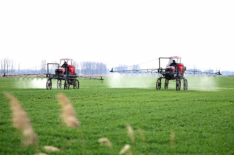 2月14日,安徽蚌埠五河縣農民駕駛農機給小麥噴灑農藥。新華社記者 黃博涵攝